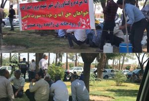 آنها در تجمع روز شنبه شعار میدادند: «یه اختلاس کم بشه ،سنوات پرداخت میشه»، «کارگر میمیرد ،ذلت نمیپذیرد»، «میایستیم میایستیم حقمونو میگیریم»، و «سکوت هر مسئولی ، خیانت است به کارگر».
